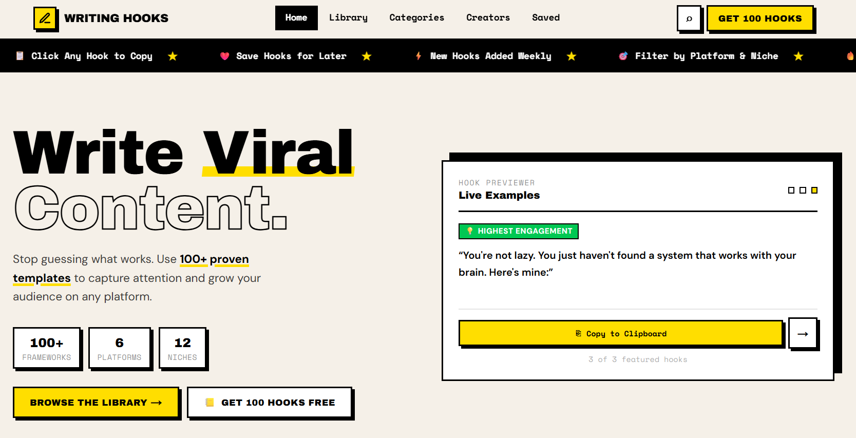 - Discover hooks from top creators like Nicolas Cole, MrBeast, and Alex Hormozi